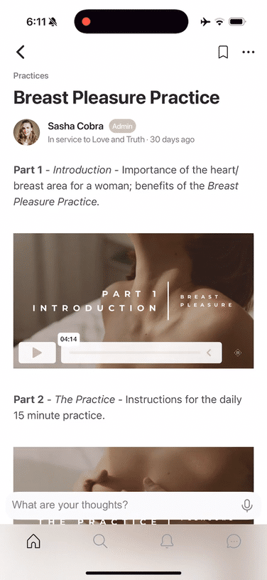 Guided practices to deepen your journey in Love, Truth, and Eros. Members engage together through daily reflections and comments, inspiring one another and fostering gentle accountability within community.