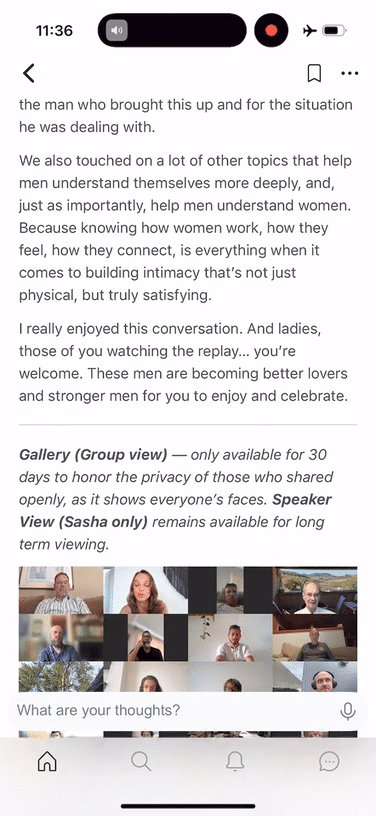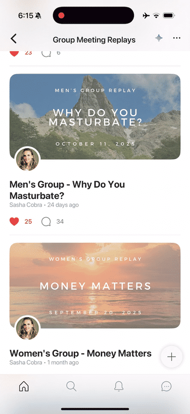 Replays of all the monthly Men’s and Women’s groups are archived, timestamped and available for both, men and women, to watch — cultivating understanding and compassion between the genders, rather than disharmony and divide.